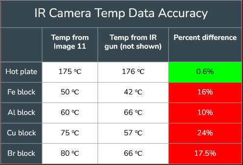 Our measurement accuracy test involved comparing the thermal camera’s measurements with that of an IR thermometer gun. We found the accuracy to differ with different materials, where the measurements of the hot plate temperature being about equal to the measurements of the copper block having a 24% difference between each other.